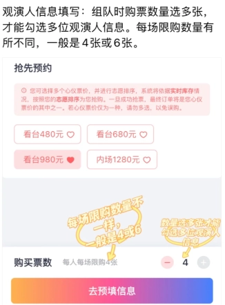 4、若成功搶到票,且多張票屬于同一票檔(例如880×4或1580×4之類),通常情況下這些票為連號(座位相鄰)。