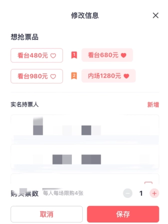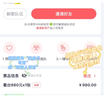 3、組隊完成后,能夠對票品信息進行修改(例如數量、票檔以及觀演人等),具體內容可查看P4和P5。