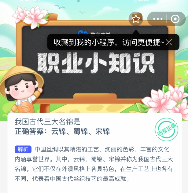 你知道我國古代三大名錦是什么嗎?這可是支付寶螞蟻新村2025年6月10日的題目哦。每天參與螞蟻新村答題,既能學(xué)到有意思的職業(yè)小知識,又能加快木蘭幣的產(chǎn)出速度,助力小鎮(zhèn)建設(shè)。今天這道題的正確答案是【云錦、蜀錦、宋錦】。云錦、蜀錦和宋錦一同被稱作我國古代三大名錦,它們不僅外觀風(fēng)格獨特,生產(chǎn)工藝也各有千秋,代表了中國古代絲織技藝的頂尖水平。