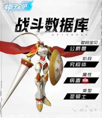 公爵獸,屬于究極體、病毒種的圣騎士型數碼寶貝。它與奧米加獸、金甲龍獸一起,被尊稱為“皇家騎士”,同屬圣騎士型數碼寶貝。“皇家騎士”擔當著網絡安全最高級別的守衛職責,正因為有這類數碼寶貝的存在,任何妄圖破壞網絡安全的行徑都注定無法得逞。公爵獸兼具病毒屬性與網絡守護神的身份,堪稱自相矛盾的數碼寶貝。一旦這種數碼寶貝失去平衡,便有可能演變為一種威脅。公爵獸身著由99.9%高純度時之數碼合金精心打造的神圣鎧甲,右手揮動著圣槍“格拉……”