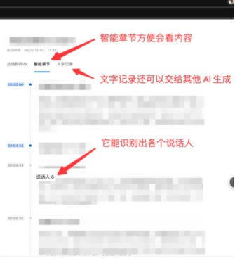 智能章節能讓定位內容更便捷,2w余字能生成完整文字記錄,還會自動按說話人A、說話人B等進行區分,極為便利。