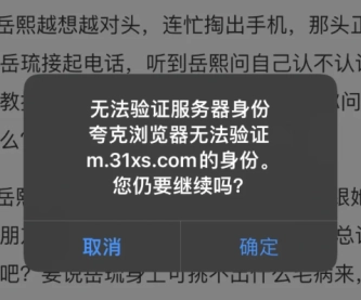近期我在使用夸克瀏覽小說時,不管打開哪個網站,都會彈出圖一顯示“無法驗證服務身份”。要是點擊“確定”,緊接著就會彈出圖二,隨后自動跳轉至黃色網站;要是點擊“取消”,則會彈出圖三。