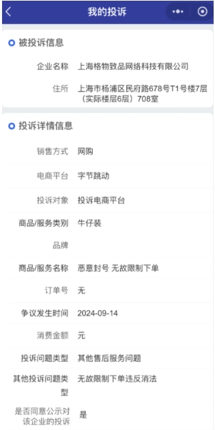 1若需投訴,可直接搜索12315小程序。投訴對象企業(yè)名稱為上海格物致品網(wǎng)絡(luò)科技有限公司,所涉平臺選擇字節(jié)跳動。