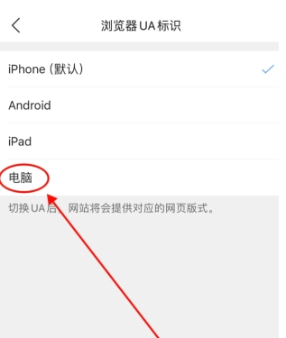 2. 前往“設置”-“通用”-“瀏覽器UA標識”,并選擇“電腦”。