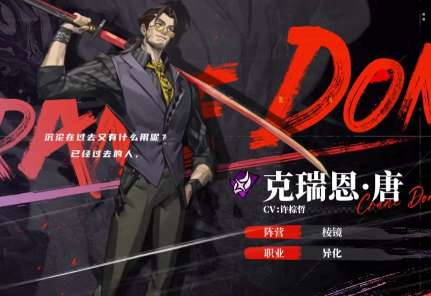 游戲里的盛唐,其角色名實(shí)則為克瑞恩唐。這一角色的形象是位成熟男士,身著西服,肩頭扛著一把太刀。克瑞恩唐看似對(duì)萬事都不太上心,閑暇時(shí)熱衷于吃喝玩樂,但實(shí)際上,他有著難以向旁人訴說的過往。