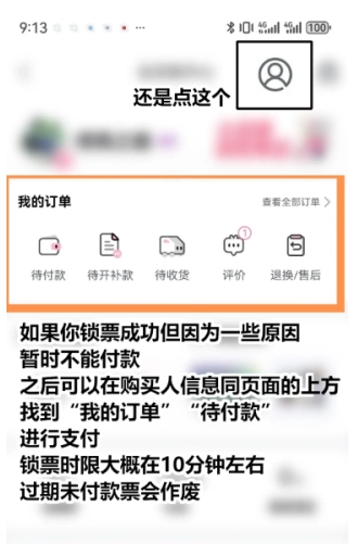 8,若您鎖票成功,卻因某些原因暫時無法付款,后續可在購買人信息所在頁面的上方,找到“我的訂單 待付款”進行支付。鎖票時限約10分鐘,逾期未付款,車票將作廢。