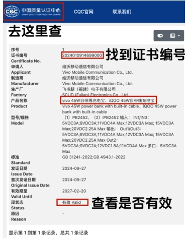 就拿我這個vivo 45W充電寶來說,向客服索要證書編號,輸入編號后查看產品信息以及有效期(這一點至關重要)。