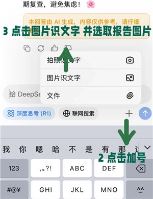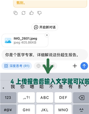 要是想用deepseek對(duì)病例和報(bào)告進(jìn)行解讀,開展圖片識(shí)別與分析工作,大家依照步驟操作即可。先輸入圖片,然后再輸入自己的問題。