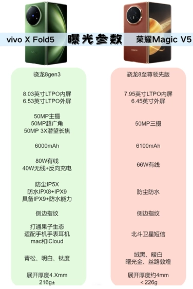 vivo與榮耀推出的兩款折疊屏手機均屬于輕薄大折疊類型。它們的內屏尺寸約為8英寸,外屏尺寸約6.5英寸。在展開狀態下,厚度均在5mm以內。重量方面,X Fold5約216g,Magic V5則小于226g 。