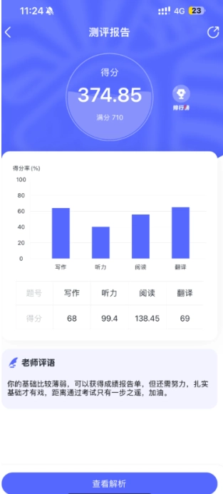 估分結束后,APP會展示預測總分以及各部分(聽力、閱讀、寫作、翻譯)的得分狀況。