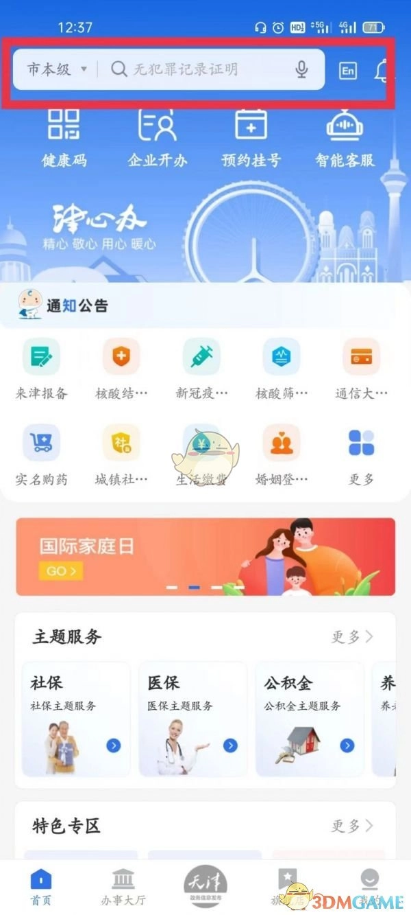 1. 打開津心辦應用程序,進入其首頁,在首頁的搜索框內輸入“居住證”進行搜索。