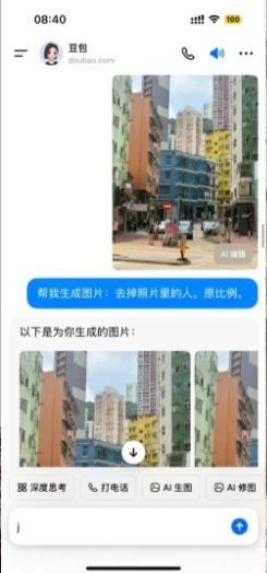 只需在 app 內輕點右側的“+”號,接著從相冊挑選圖片上傳,豆包便會自動開啟“AI 修圖”模式,此時輸入文字指令或者使用語音,即可輕松開始操作。