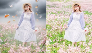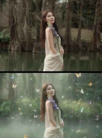 在不改變人物細節與構圖的基礎上,增添夢幻般的朦朧氛圍,營造出仿若綠野仙境的視覺感受,同時在人物的四周添加上翩翩飛舞的蝴蝶。
