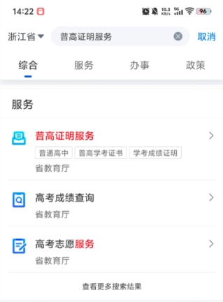 2. 在APP頂部搜索框輸入“普高證明服務” 。