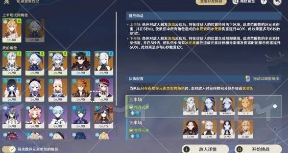 下半場遭遇的敵人包括水幻形和雷深淵法師,選用以冰元素為核心的陣容,相對更容易獲取分數。要是你尚未培養出實力強勁的冰系主C角色,不妨考慮使用試用角色神里綾華,將其與申鶴、珊瑚宮心海以及愛可菲組合,構建一支永凍隊。