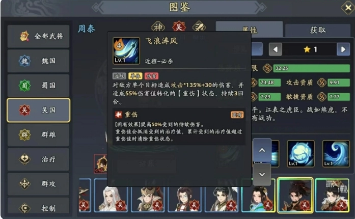 這種流血情形會延續三個回合,而且處于流血狀態中的敵方目標,所獲治療效果會大幅降低。在加點上,對于周泰,建議選擇全武力加成的方式。畢竟作為輸出型武將,武力屬性的提高能直接強化他的技能傷害。說到陣容搭配,考慮到周泰的神將身份及其技能特性,大家不妨以吳國陣營的神將為核心來搭建陣容體系。