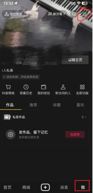 1. 首先打開抖音,接著點擊界面下方的“我”,隨后點擊右上角的三條杠圖標。