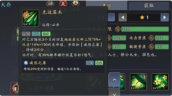 大喬的技能機制方面,大家不妨先留意她的大招“無邊落木”。此技能能挑選三名隊友,為他們帶來生命上限5%加上攻擊14%再加上150的生命值提升。并且在回復生命值之際,還會附上減傷之盾,可降低25%的傷害,觸發1次后該護盾就會清除。這個護盾能助力隊友抵御敵方的一次爆發傷害。此外,該技能還有30%的概率額外回復1點怒氣。如此設定,讓大喬在釋放大招時,有一定幾率為隊友創造更快釋放大招的機會。從定位來講,“無邊落木”是團隊核心的治療技能,其護盾與回怒的雙重收益,在團隊中是頗為重要的一個效果。