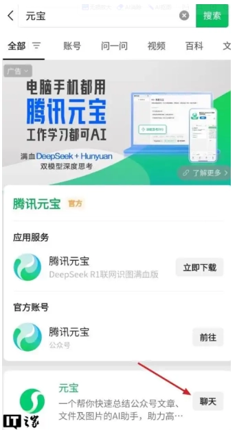 只需在微信中搜索“元寶”,就能發現“聊天”入口,點擊該入口便可進入。