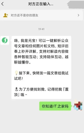 在微信的聊天對話框里,微信用戶能夠和元寶展開實時交流。當用戶輸入對話內容時,元寶還會像真人聊天一樣,提示“對方正在輸入...” 。