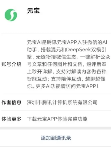 另外,用戶能夠把元寶添加至通訊錄,如此便能夠在聊天列表以及聯系人名單里看見元寶。