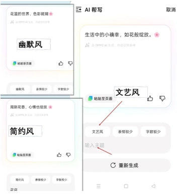 2. AI手機能夠自動生成朋友圈文案,支持在多種風格中挑選,比如文藝風、幽默風、簡約風等等,同時還能對文案的字數、表情等進行設定。另外,用戶也可以自行輸入主題。