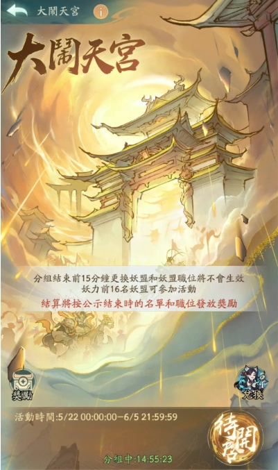 大鬧天宮依舊以妖盟為單位參與,參與時間是10:00至22:00 。活動設有4個妖族陣營,分別為焚天、鎮岳、裂海、絕風。每個妖盟會被隨機劃分至一個妖族陣營之中,且每個陣營容納4個妖盟。