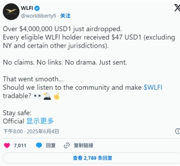 2025年6月4日,World Liberty Financial將向WLFI代幣持有者空投最多47枚USD1穩定幣。此次空投基于2025年5月的社群提案,僅已完成KYC的錢包地址可參與。