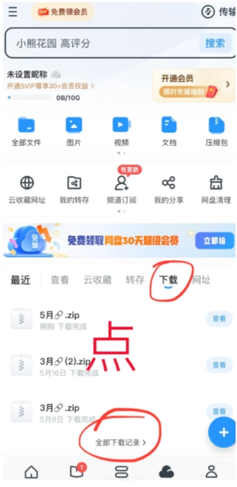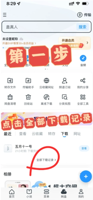 1. 開啟UC瀏覽器APP,輕點網盤進入,接著點擊全部下載記錄。