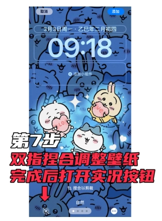 7. 進入壁紙設置環節,通過雙指捏合來調整壁紙,完成調整后,打開實況按鈕,即可預覽動態壁紙效果。