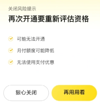 關閉之后,或許無法再次開通。若嘗試關閉后重新開通,系統會對您的開通資質以及可用額度重新進行評估,并且再次開通的成功率不高,還請您慎重抉擇。