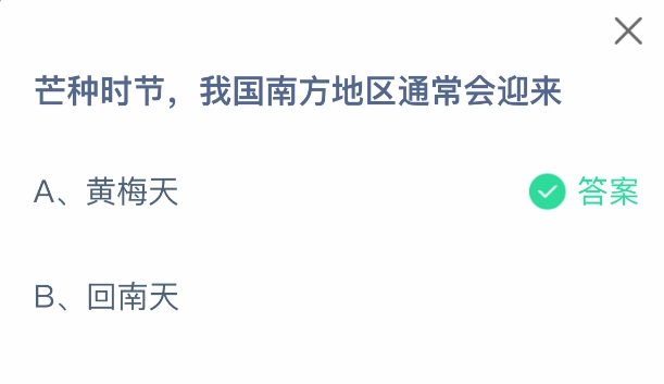 芒種時(shí)節(jié),我國(guó)南方地區(qū)通常會(huì)迎來(lái)什么?這是支付寶螞蟻莊園6月5日的小雞答題題目。支付寶小雞答題是深受大家喜愛(ài)的活動(dòng),通過(guò)獲取飼料就能喂養(yǎng)小雞,進(jìn)而領(lǐng)取更多雞蛋去幫助更多人。今日這道題的正確答案是【黃梅天】,也就是說(shuō),芒種時(shí)節(jié),我國(guó)南方地區(qū)通常會(huì)迎來(lái)黃梅天。