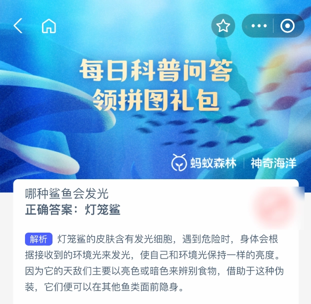2025年6月4日,支付寶螞蟻森林神奇海洋的問題已更新。今日題目為:哪種鯊魚會發(fā)光?正確答案是【燈籠鯊】。燈籠鯊的皮膚中有發(fā)光細胞,當遭遇危險時,其身體會依據(jù)接收到的環(huán)境光發(fā)光,從而讓自身與環(huán)境光的亮度保持一致。