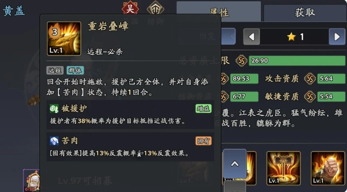 黃蓋的被動技能“聚元為力”,可使黃蓋的生命上限提升20% + 6 。當黃蓋遭受控制時,還能額外獲得4.5%的傷害減免。此效果讓黃蓋在面對諸如冰凍、沉默等控制技能時,依舊能夠扛住敵人的攻擊,防止援護鏈中斷。而被動技能“老當益壯”堪稱他殘血反震流的關(guān)鍵所在。依據(jù)該技能效果,黃蓋血量每降低10%,反震概率便增加4%,反震效果提升2% ,當血量最多降低70%時,反震概率增加28%,效果提升14% 。