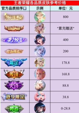 接下來,我們再瞧一瞧《王者榮耀》各品質皮膚的參考價格。
