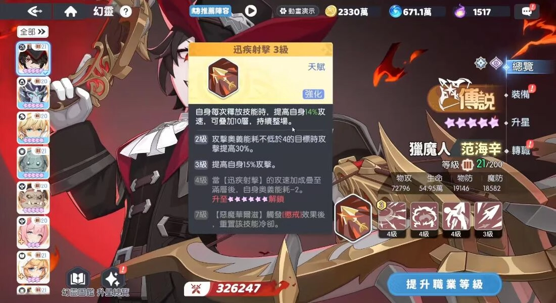 最佳組合為:范海辛搭配奧術導師(高頻奧義)以及鋼鐵壁壘(群體降防)。奧術導師每隔20秒釋放的奧義技,能為范海辛疊加1層喚醒效果,如此可保證每場戰斗中至少觸發3次額外惡魔弩箭(傷害為380%×3 = 1140%單體傷害)。而鋼鐵壁壘的“碎甲怒吼”技能,可實現群體降防40%,與范海辛的手雷效果疊加后,能達成70%的物防削減,這使得惡魔華爾茲對坦克單位的傷害提升300% 。