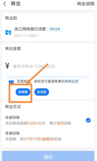 4進(jìn)入余利寶界面后,點(diǎn)擊轉(zhuǎn)出。此時(shí)中間的對話框顯示余利寶可直接免費(fèi)轉(zhuǎn)賬和還款,在此句話下方有兩個(gè)藍(lán)色選項(xiàng),點(diǎn)擊左邊的“去轉(zhuǎn)賬”,接著選擇自己名下的銀行卡,輸入轉(zhuǎn)賬金額,付款方式選定為余利寶。
