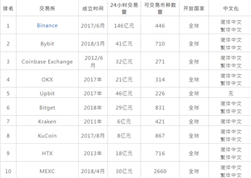 以規模和交易量來說,可以觀察到前幾名和后面幾名落差很大,另外,也不是每個交易所都有中文。原則上,不在這排行榜上的交易所就不用考慮了,以下是排名整理表格,這個表格未來隨時間仍會持續變動。