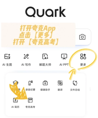 1,打開夸克APP,點(diǎn)擊更多--選擇【夸克高考】;