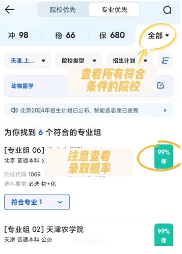5,查看符合條件的所有院校(可以在頂部選擇【院校優(yōu)先】or【專業(yè)優(yōu)先】),注意右側(cè)的錄取難度;