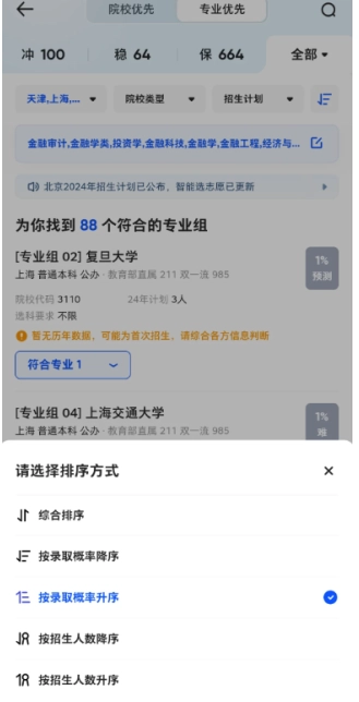 5. 依據自身位次,初步篩選專業錄取位次在自身位次基礎上增加10%到減少50%(此處百分比表示位次幅度,并非夸克所指的概率)范圍內的院校。