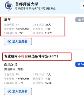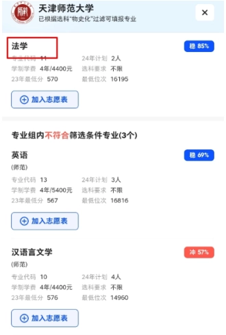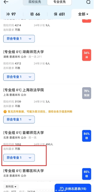 6. 依次點擊“符合專業”按鈕,留意該院校該專業的招生信息以及錄取難度(需參照該專業的錄取位次,注意并非院校最低錄取位次),同時關注該專業組下顯示“不符合篩選條件”的專業。
