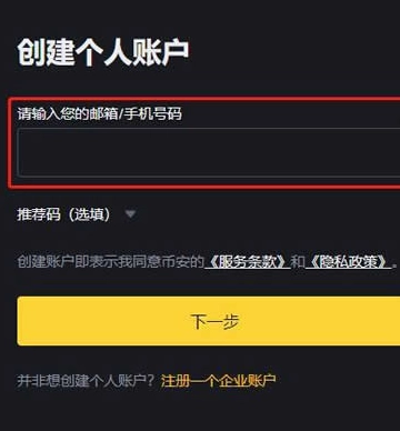 2、幣安已全面開放大陸用戶進行手機號注冊,輸入郵箱/手機號、點擊下一步即可