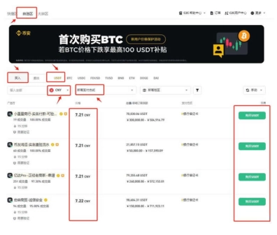 6、開展現(xiàn)貨交易之前,需獲取USDT,可通過一鍵買幣自選區(qū)買入。要留意,法幣應選擇CNY,隨后依據(jù)自身需求挑選交易商家。
