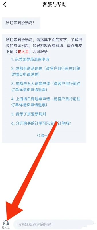 只需輕點【轉人工】,就能在紛玩島APP中聯系到人工客服。
