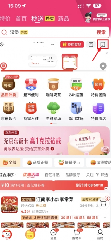 1. 開啟京東APP,找到并點擊秒送頁面,接著點擊小編所畫圈的位置。