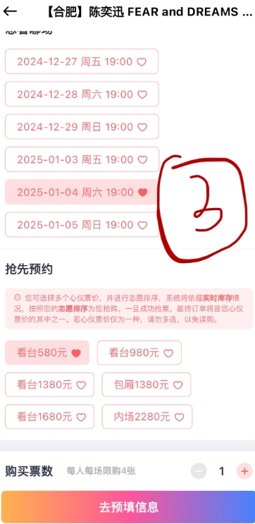 3. 選擇意向場次和價位。若有多個心儀價位,可按照志愿順序進行搶票;若僅想要一種價位,就無需多選。