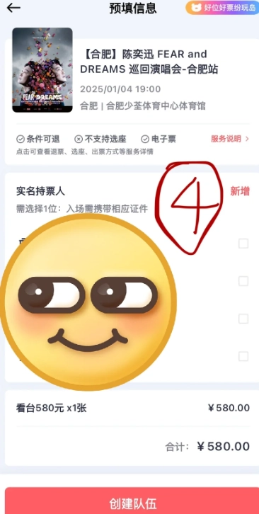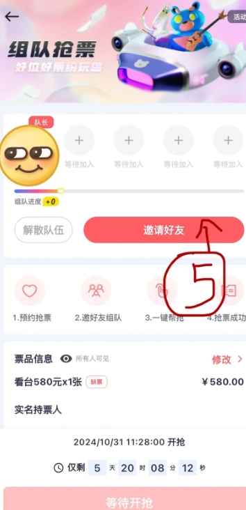 5,邀請朋友一起加入搶票隊伍,朋友只需進隊即可,你的身份信息已預先填好。要是你想改動身份信息,可直接修改,無需解散隊伍重新開啟。規則允許邀請不看演唱會的朋友幫忙搶票,從最優策略來講,多開幾個隊伍更好,比如四個人每人開一個隊伍,這樣最多能有20人一同搶票,因為一人可以喊四個人加入,但一個人最多只能參加一個隊伍。