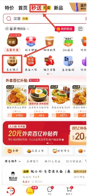 1. 開啟京東APP,點擊“秒送---京東飯卡”。