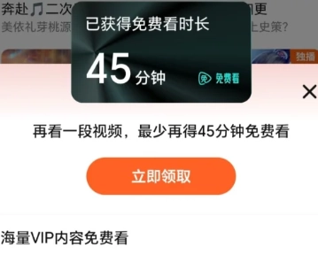 1. 部分小伙伴打開騰訊視頻app時,會自動彈出“騰訊視頻vip片免費看”的彈窗,點擊“立即免費領取”,接著按要求完成看廣告任務。每天僅需觀看幾十秒廣告,就能獲取幾小時免費看劇的權益。